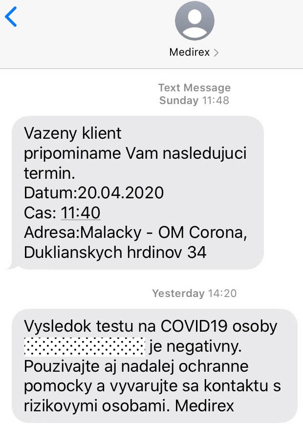 Výsledok vyšetrenia by vám mal prísť do 48 hodín SMS správou a na e-mail, ktoré ste uviedli pri vyplňovaní kontaktných údajov. V prípade pozitívneho výsledku by vás kontaktoval Úrad verejného zdravotníctva. Na druhý deň, za 26 hodín nám už prišla SMS s výsledkom testu – NEGATÍVNY.